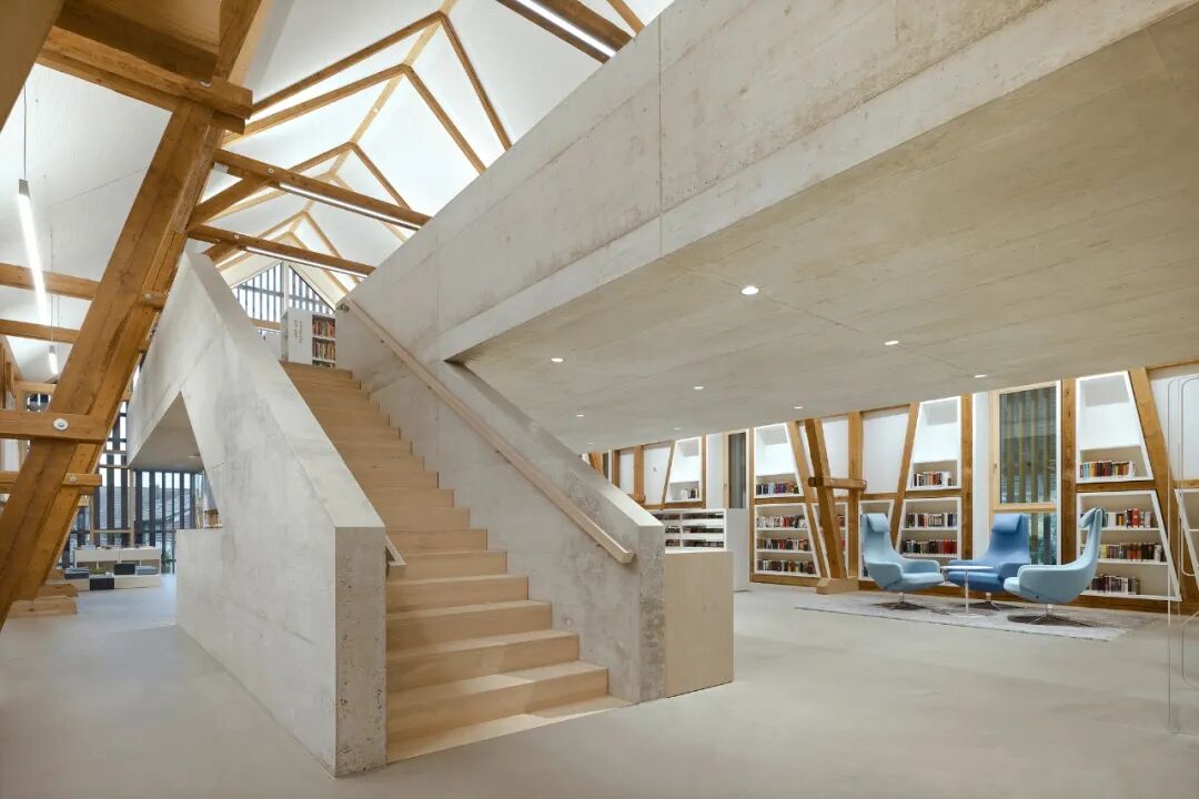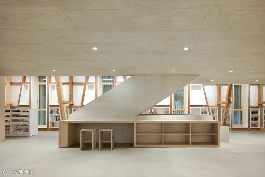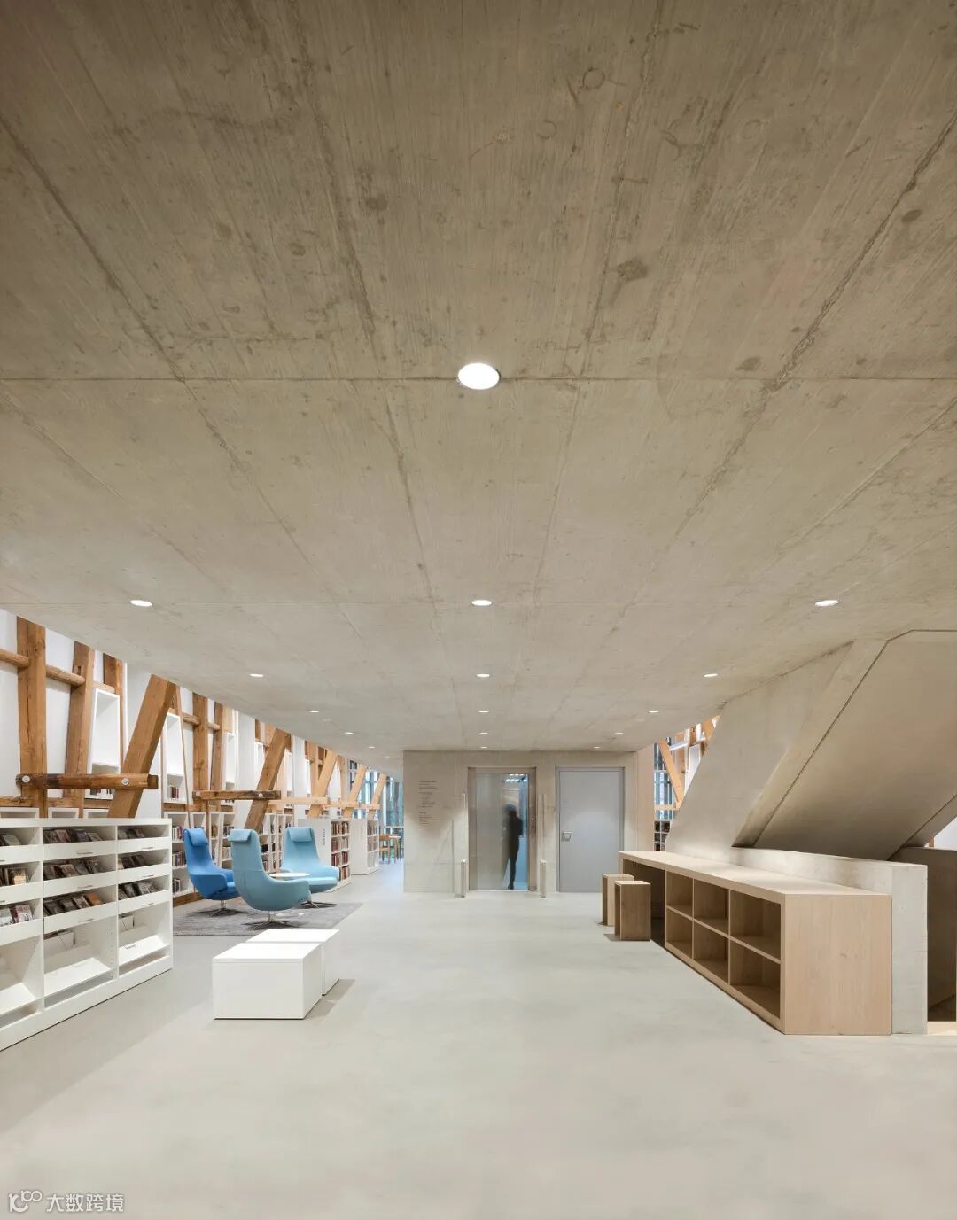 一楼的图书馆,有媒体和杂志廊以及阅读站,提供了令人惊讶的开阔视野,贯穿整个建筑。特别是在这里,新旧两方进入了一个令人兴奋的对话。过去和现在的平衡不仅从外面看,而且特别是从内部看,都成为这座建筑的特殊品质。