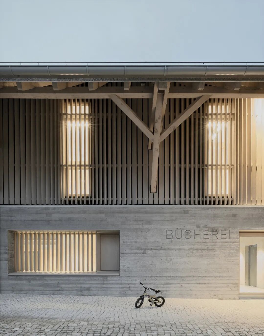 At its prominent location within the village, close to both the town hall and the festival hall, the barn’s new public use as a library and community center has established an important connection that now links the three separate buildings. An inviting forecourt and a broad outdoor terrace reinforce the barn’s new public character and encourage people to linger. The erstwhile, rather introverted storage building has become an open house that conserves its familiar image, with the solid base and large, open timber roof structure, while at the same time speaking an unequivocally modern language with the materials used and the large openings on the ground floor.
