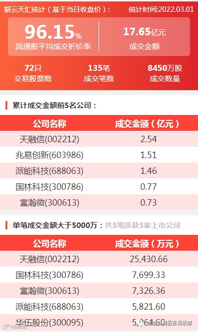 2022年3月1日,大宗交易成交金额17.65亿元,交易股票数72只,成交笔数135笔,流通股平均成交折价率96.15%,成交数量8450万股。