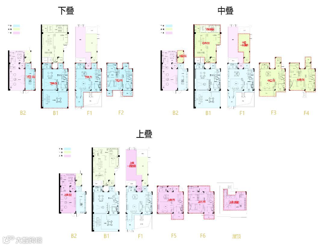 而“品字形”的上下叠墅为了避免这一问题,横跨两个下叠,为上叠提供了两个下叠全然没有的大开间。