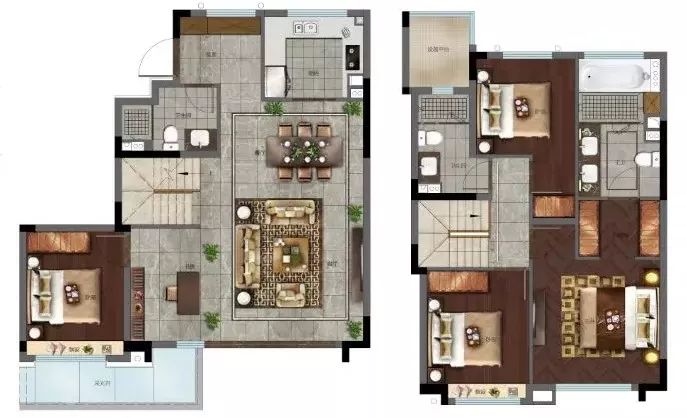 空间布局打破了传统叠拼的构造,设计出“2+2+庭院”的结构,在相对有独立空间的基础上,私密又和谐互动。
