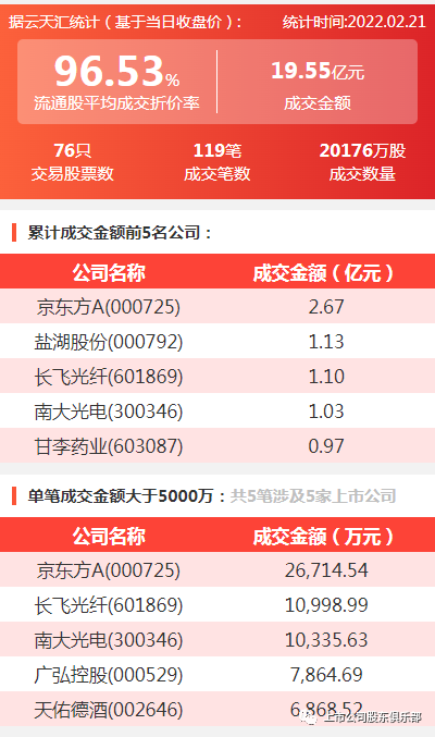 2022年2月21日,大宗交易成交金额19.55亿元,交易股票数76只,成交笔数119笔,流通股平均成交折价率96.53%,成交数量20176万股。