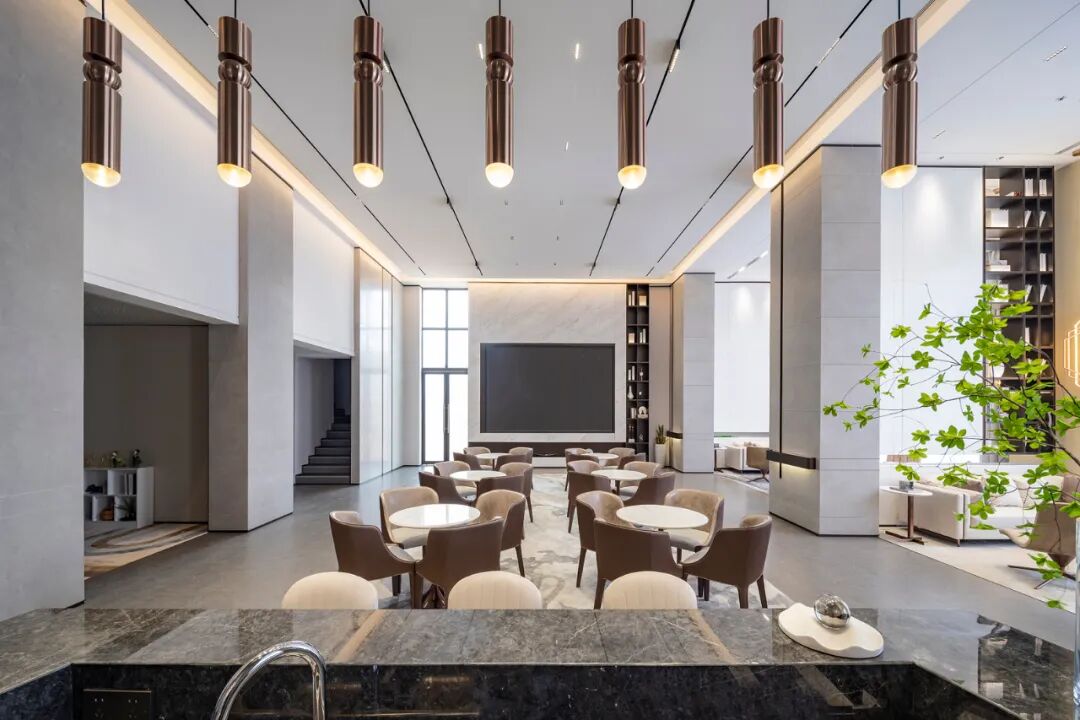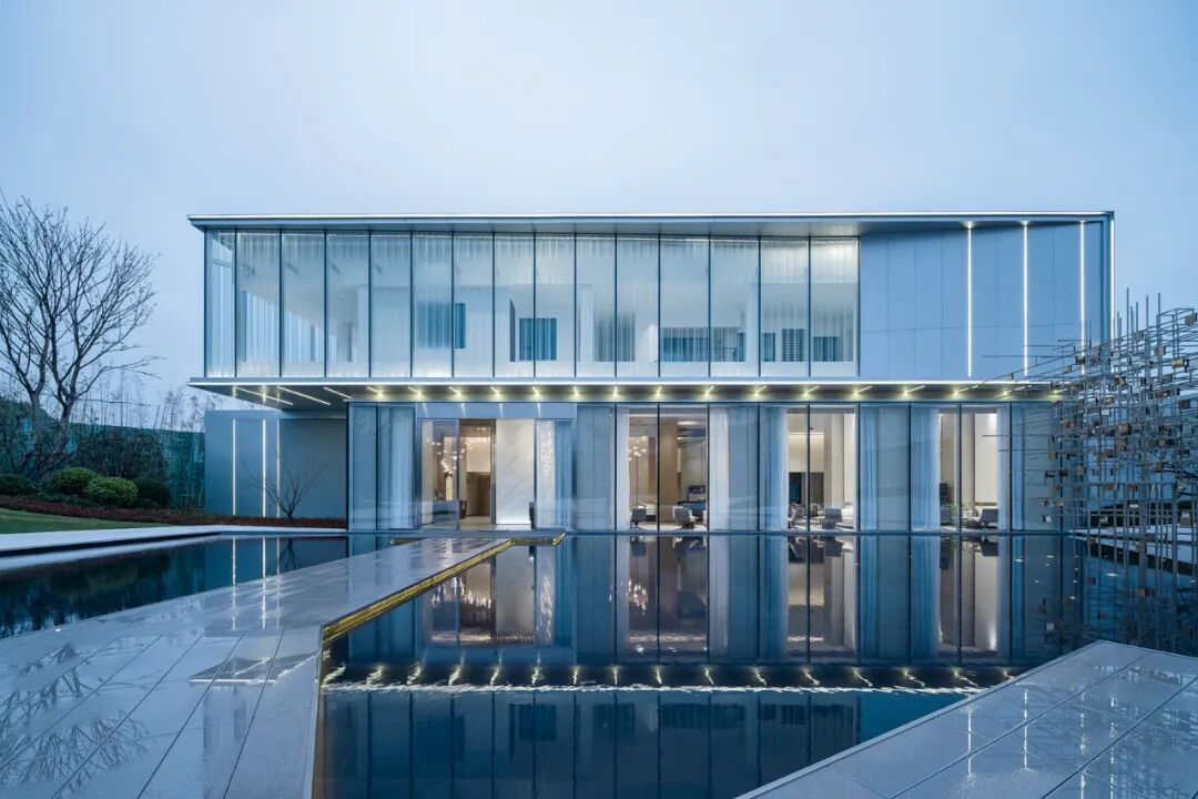 徜徉于明亮开敞的室内空间,目光透过落地超白高透玻璃,聚焦在平静恬淡的镜面水体之上,景墙光影,或虚或实,隐约绰然;水边掩映的花树,繁盛多姿,勾起都市人对于美好生活的无限向往。明澈的水面、美丽动人的绿植、朦胧缥缈的天空,带来舒适的观景体验。