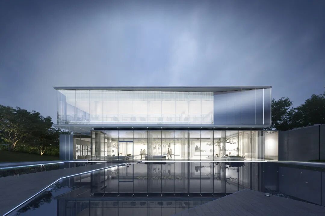 基于用户沉浸式体验的需要,营造流动空间,注重人与自然的交互,洁白无瑕的玻璃幕墙与波光粼粼的水面混为一体,建筑就像从自然中生长出来。