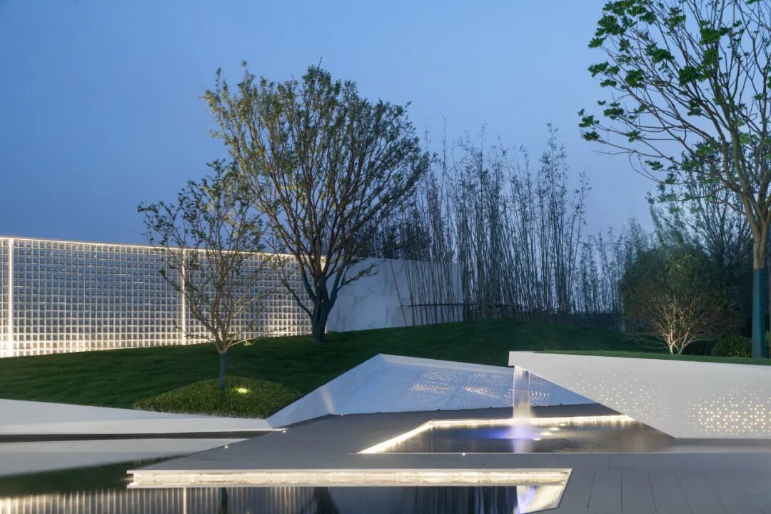 夜间,灯光四起,条形的灯带装点着建筑,几何的视觉冲击映入眼眶,银白色的灯光倒映在水面,亮化的点缀无疑增加了示范区精致度。