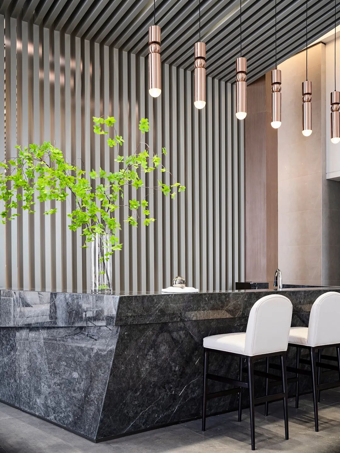 天花间缝处吊灯的巧妙设计,无数颗细碎的晶体似流星般悬垂于上空。映照满堂闪烁的光影。漫天晶莹似乎触手可及,白天与黑夜相映成趣。U型的台面切角,几何的构成,精心考究的细节,搭配上简洁的吧椅。从风格定义来说,映入眼帘的便是一个极简的现代空间。