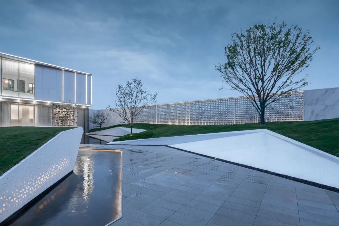 入口处冲孔钢板和水景的穿插犹如一轮明月驻足在前,不仅指向未来的方向也指向这人们归家的方向。