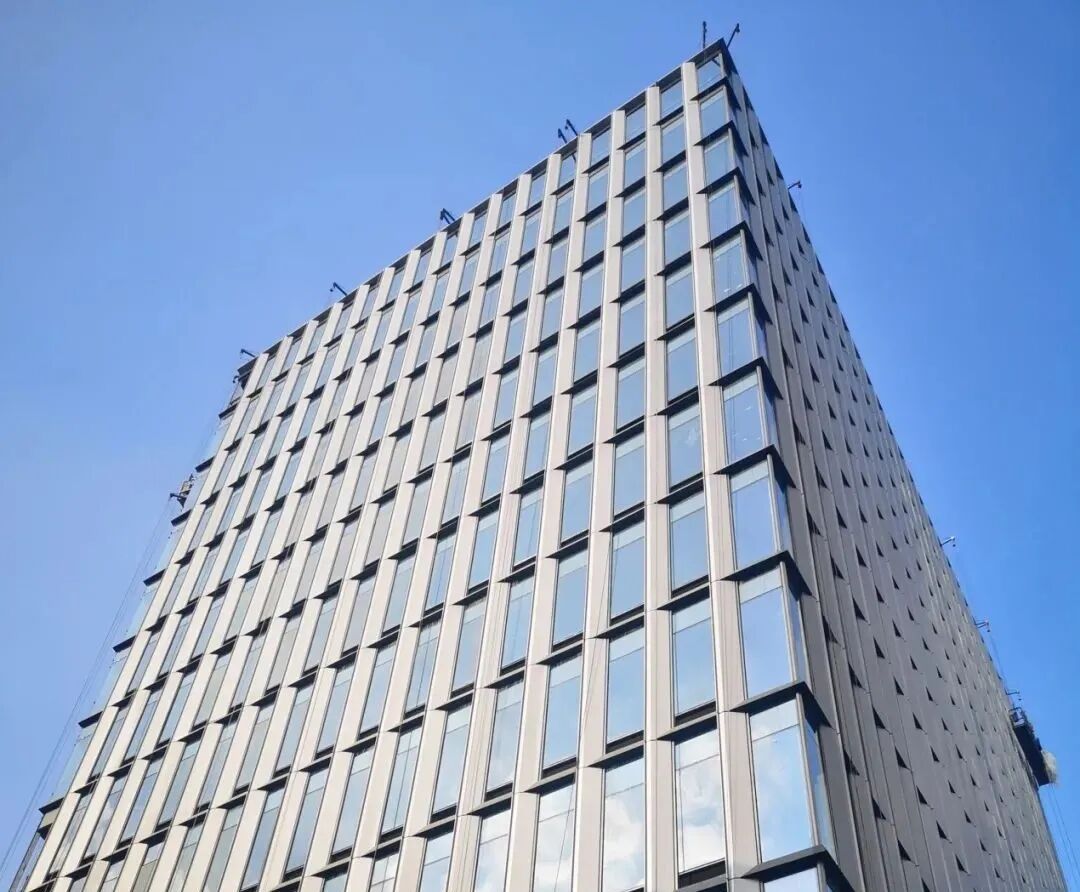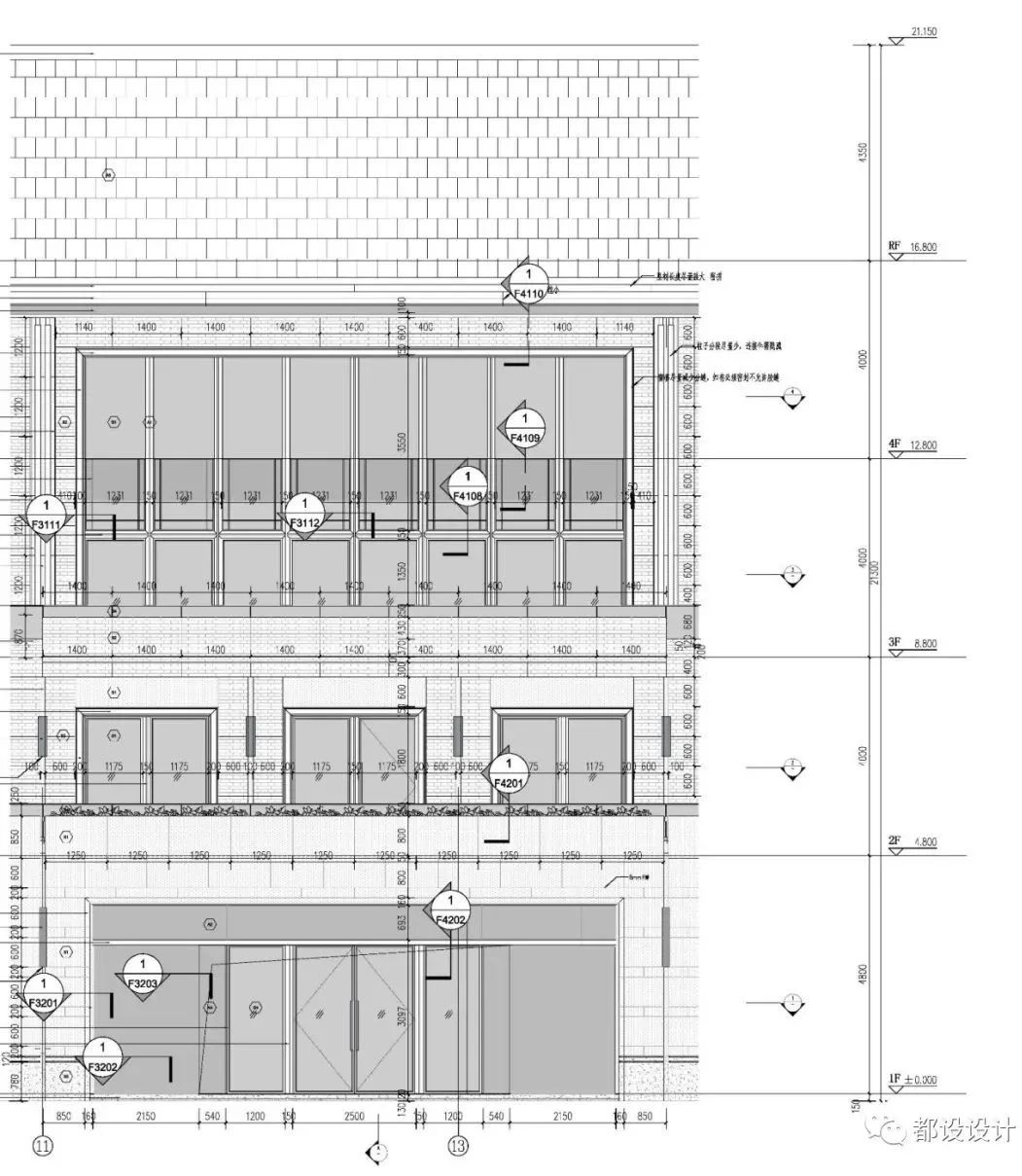 塔楼柱子的地方内凹,一方面减少这一块的无效面积,同时解决掉单元的开窗,并且减小了每一个幕墙单元的横向距离,保证了每块玻璃在4平米以内。最后这个外墙项目的综合单价为1380,在高层和多层上都使用了单元幕墙。