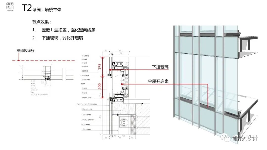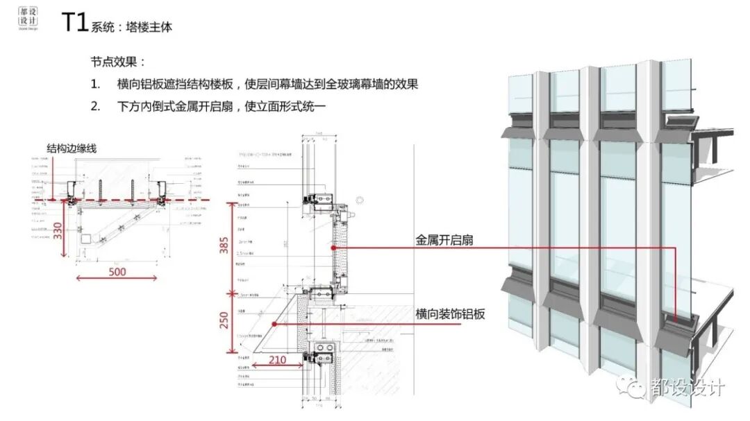 塔楼标准段幕墙体统分为层间幕墙和全玻璃幕墙两种。玻璃幕墙通过层间横向的装饰铝板和竖向的下挂玻璃,弱化开启扇对立面整体性的影响。不多的凹槽部分和突出的玻璃幕墙部分采用相同的开启扇模式,这样效果较为统一,对框架式幕墙来说施工也是容易出问题的地方,一致的做法也降低了施工出错的风险。