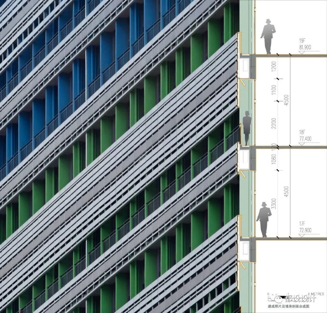 140米高的楼如果按照标准段来做会很无趣,宽的窄的线条又不能用装饰的手法来做,因为费钱,所以巧妙地将空调百页与阳台栏杆的变化进行组合,一宽两窄和一宽一窄的韵律感就出来了。