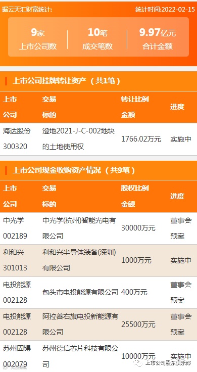 2022年2月15日,资产交易合计金额9.97亿元,上市公司9家,成交10笔,上市公司挂牌转让资产1笔,上市公司现金收购资产9笔。