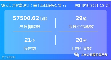 2021年12月24日,股票质押总质押股数57500.62万股,上市公司数20家,股质公告笔数29笔,股东数21个。