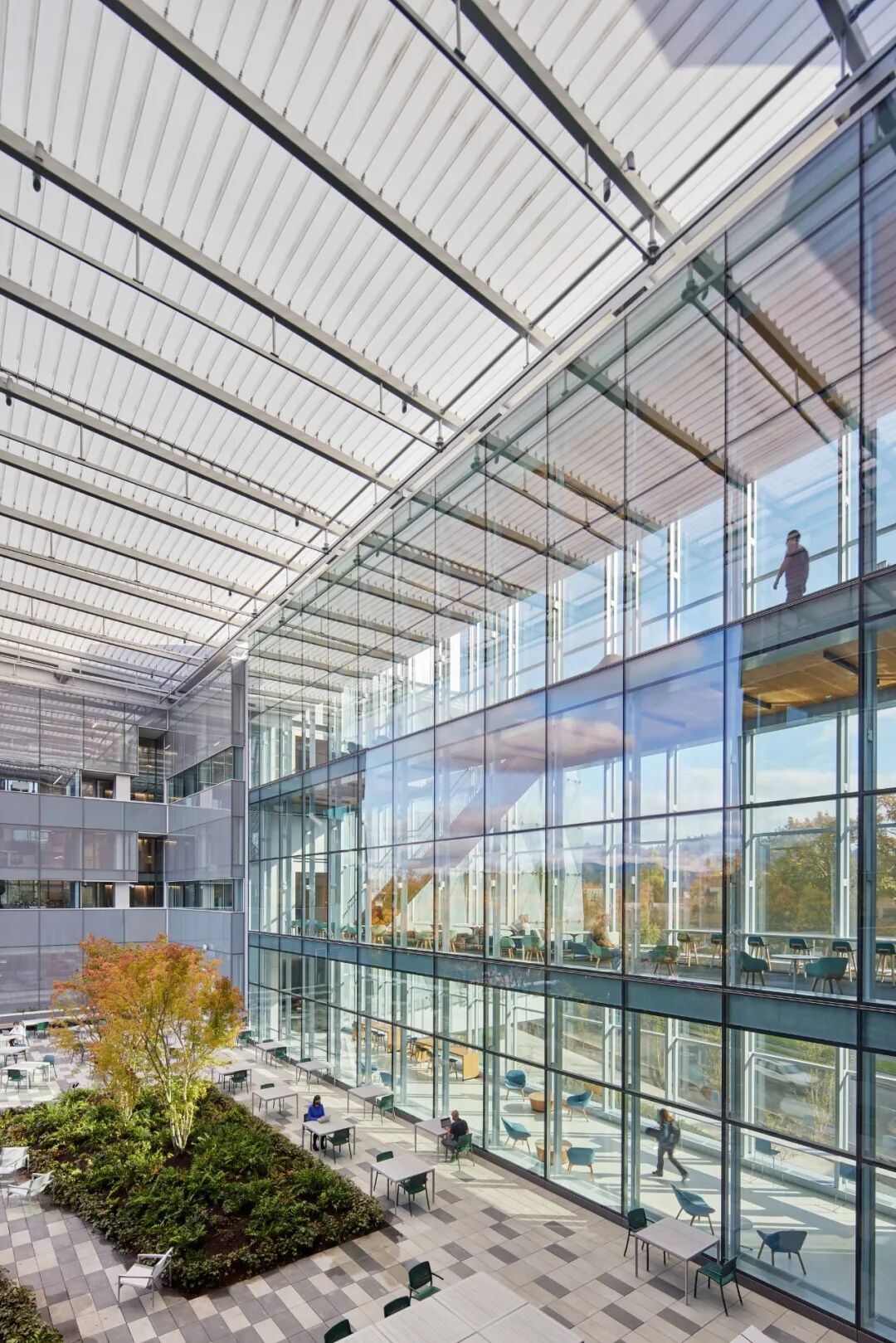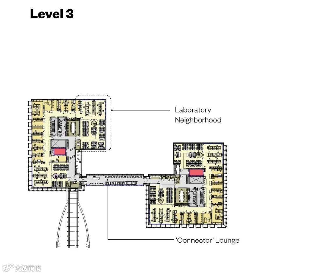 整个设施内分布着开放的、规模可变的工作空间,使研究小组可以离开实验室,利用不同的公共环境。
