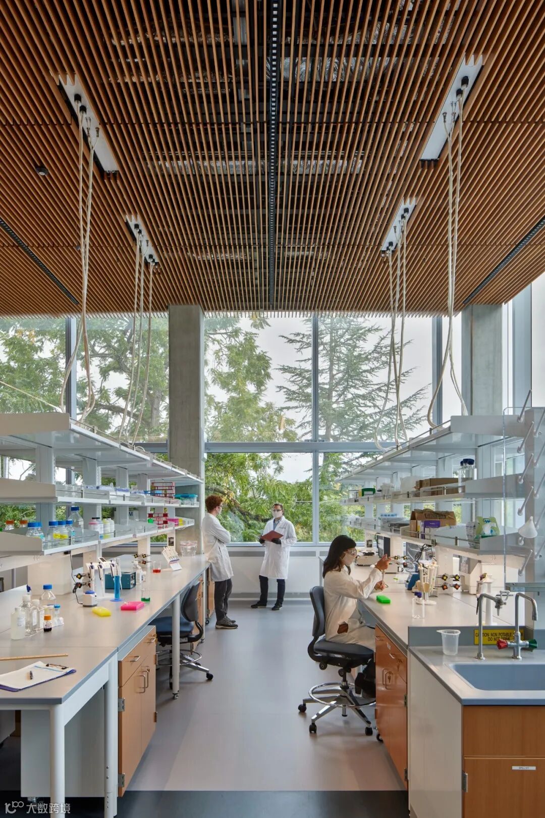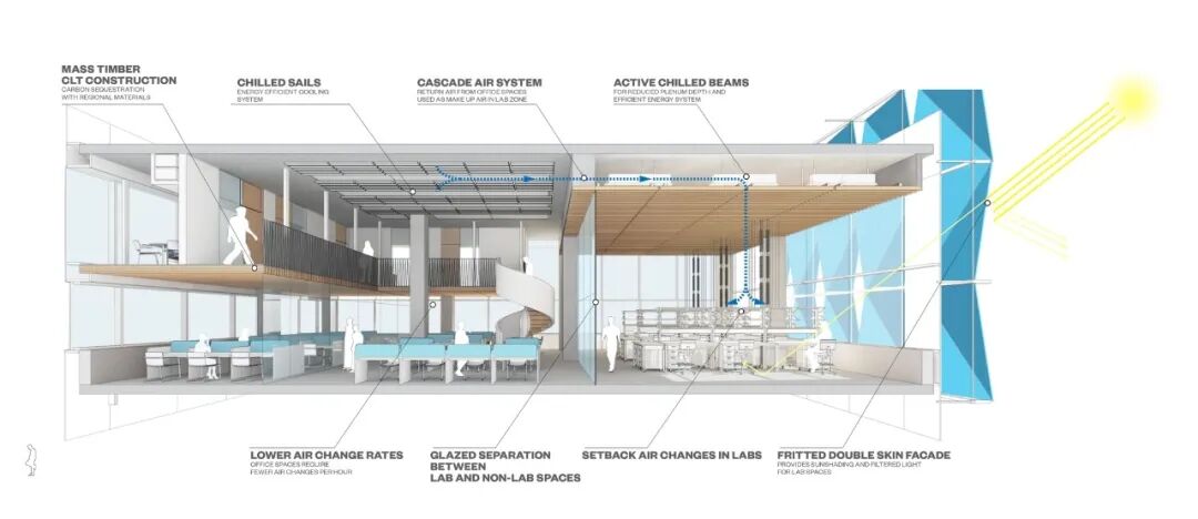 该设施的上两层包含跨学科研究区,将实验和计算研究结合在一起。21英尺高的地板到地板的高度,使得大量木材的悬空夹层结构包含了教师的办公室,为他们的实验室和研究生创造了一个新的空间。
