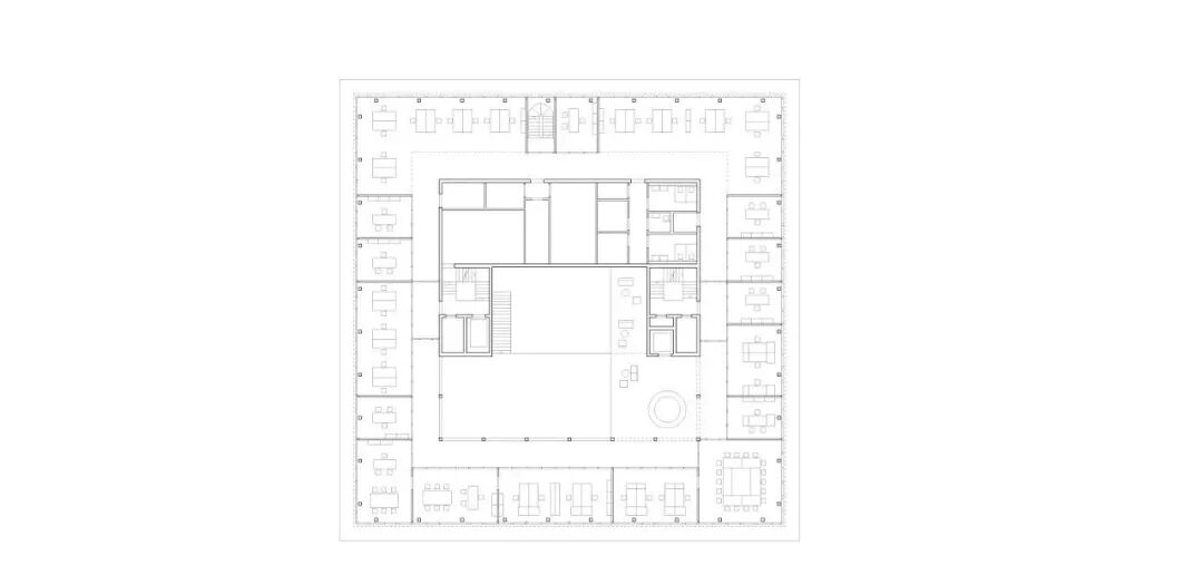 办公室环形的深度使所有工作空间都能获得日光,以及接近户外,同时合理性确保了重新配置的长期灵活性。
