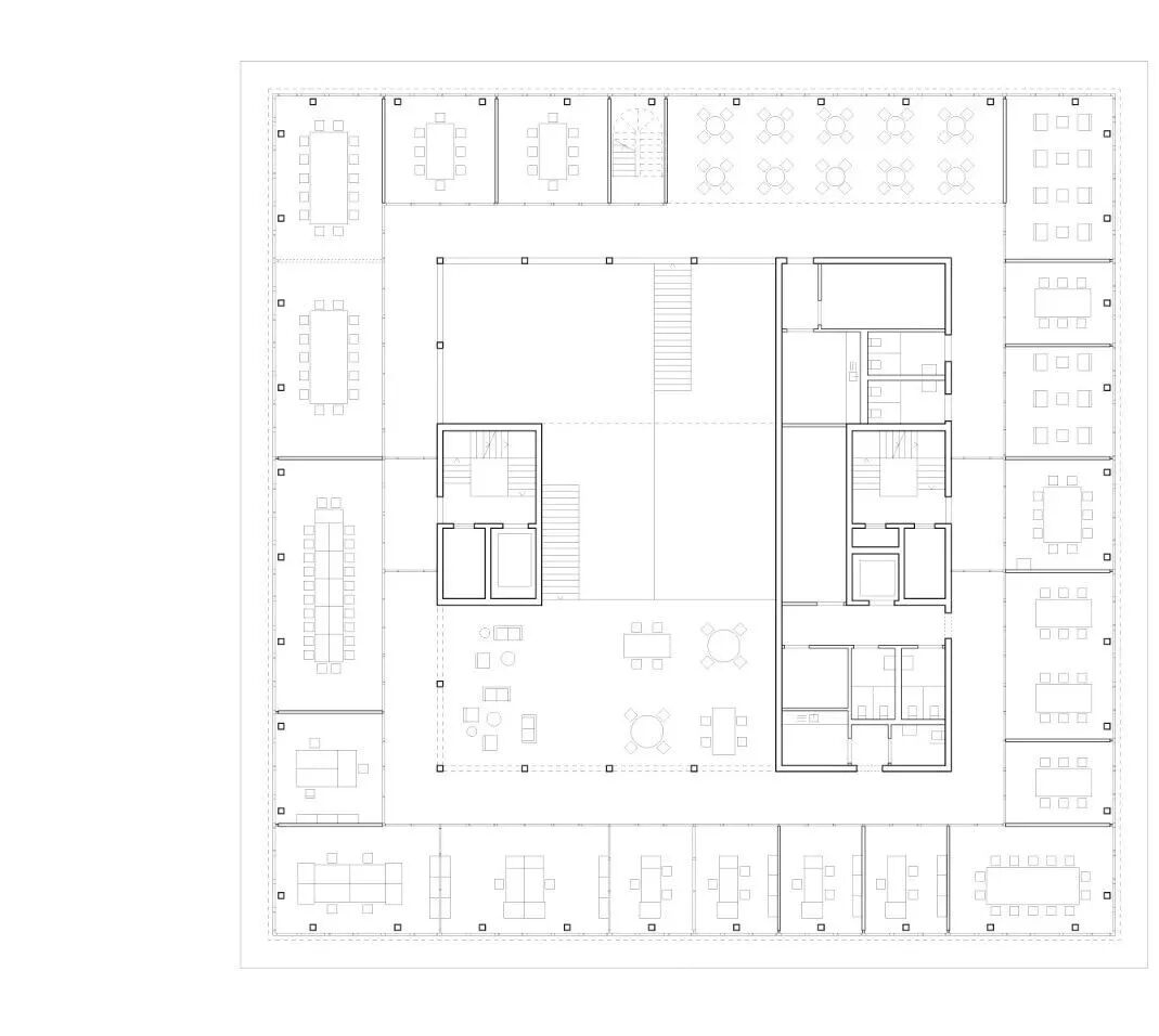 在这个中庭周围有一个灵活的办公室环。轻质隔断确保了多种类型的办公室和会议室的重新配置。