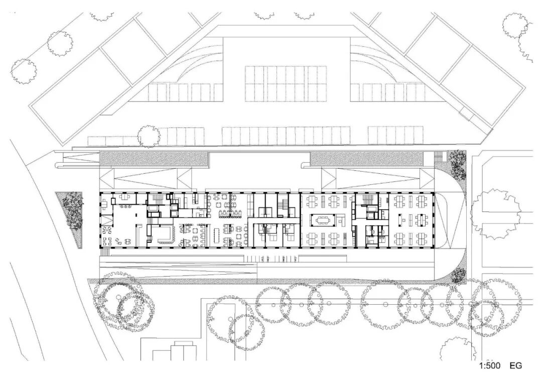 在材料上,它也与邻近的纪念碑的砖块联系在一起。均匀分布在表面的窗户创造了一个抽象的立面形象,如同一张纵横交错的线条网。