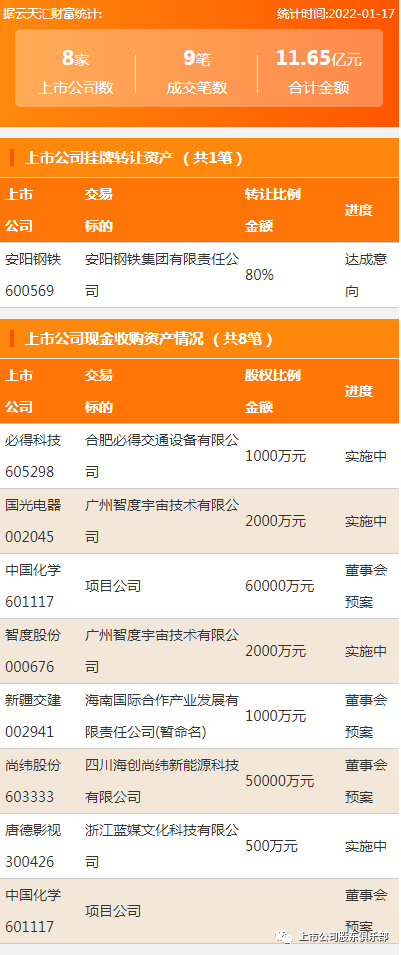 2022年1月17日,资产交易合计金额11.65亿元,上市公司8家,成交9笔,上市公司挂牌转让资产1笔,上市公司现金收购资产8笔。
