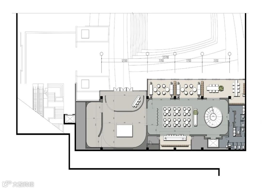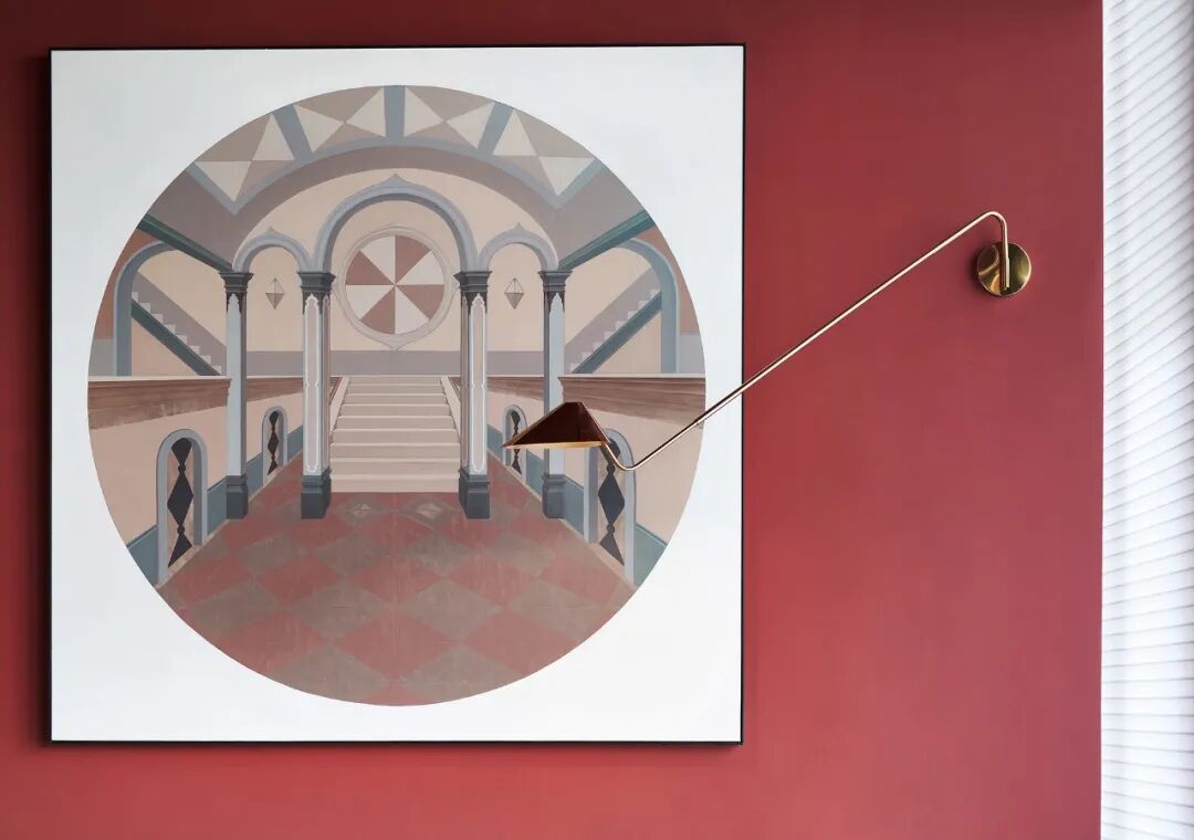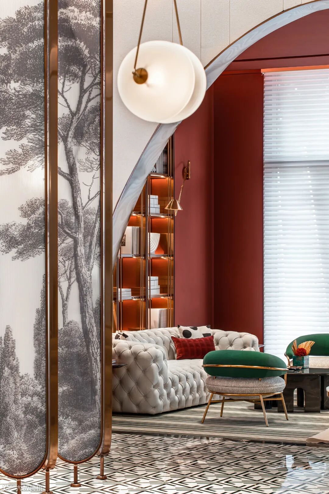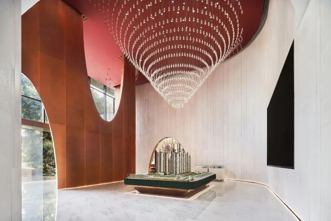 大小、形制不一的弧线拱门,延续了视觉上的艺术纵深感,串接起沙盘区与各功能区的关联点。在细节上,设计师以有趣的色彩、简约的形制、精致的灯饰点缀空间,烘托出润雅圆融的艺术气息。