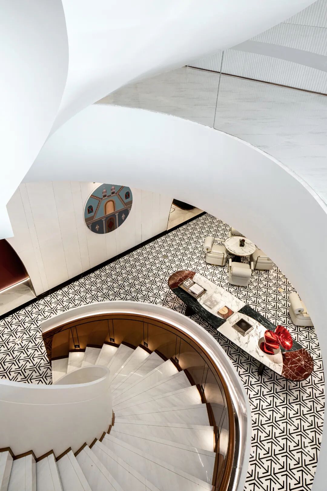 正如柯布西耶所说:“基于秩序的原则,这才是自由。”李益中在旋转楼梯上的艺术表达,不仅是基于策略性而营建的空间亮点,更是一种功能与秩序、自由与线条达至平衡的状态。目之所及的曲折,移步异景的蜿蜒,如此富有艺术张力的自由之境,定格在设计师笔下,亦停格在来访者的相机之中。