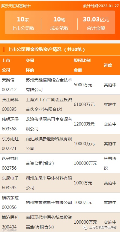 2022年1月27日,资产交易合计金额30.03亿元,上市公司10家,成交10笔,上市公司现金收购资产10笔。