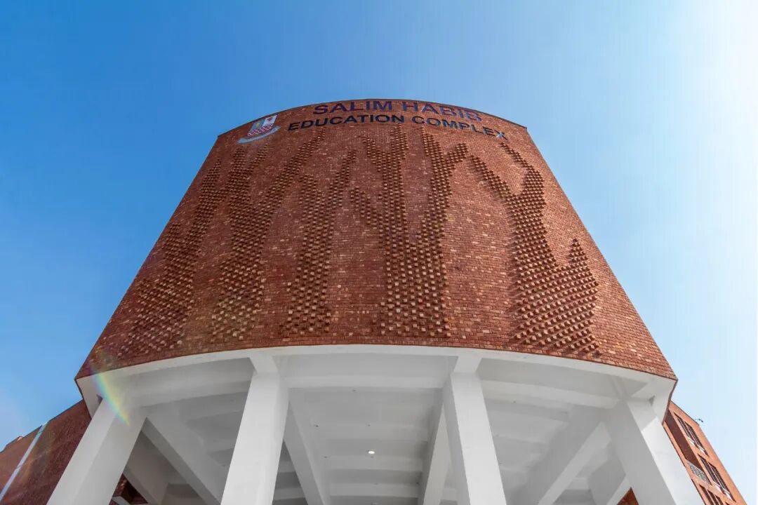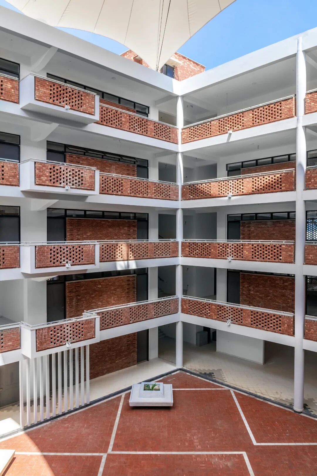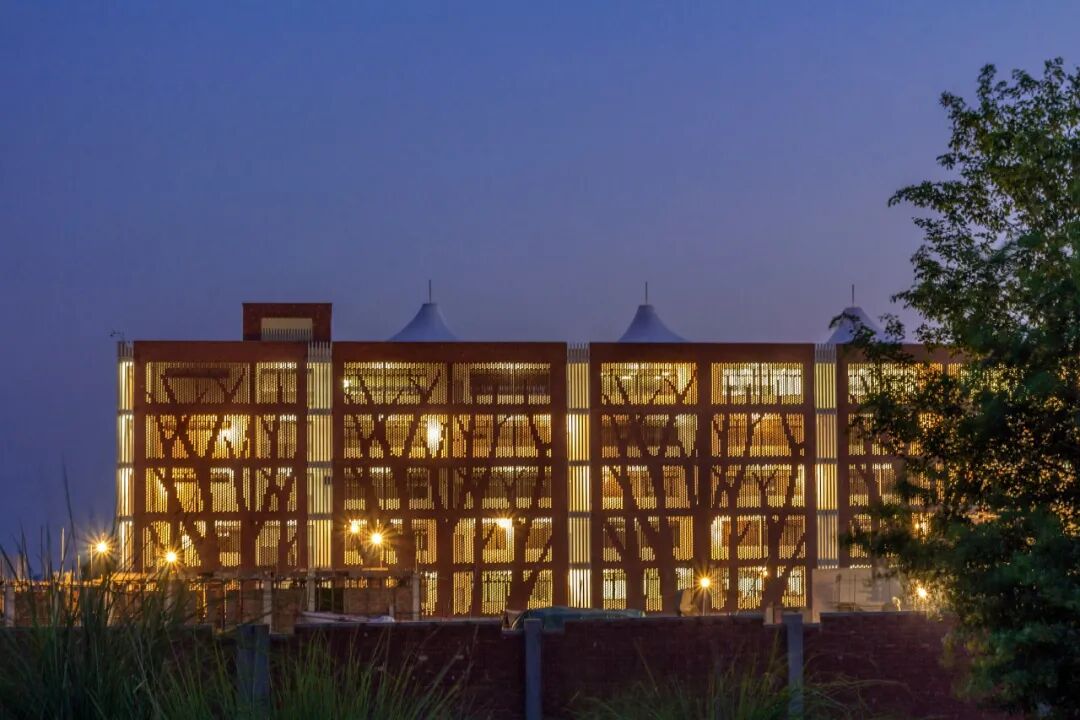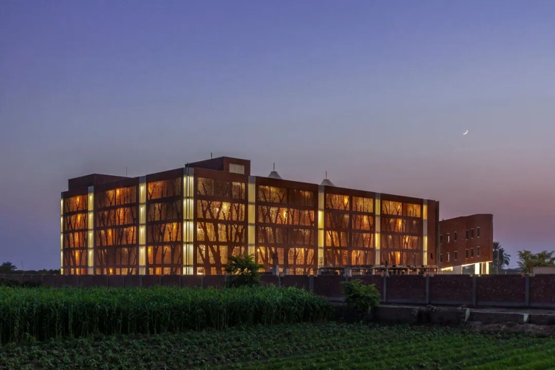 One of the many challenges of the site was extreme temperatures in hot seasons thus there was a need to insulate the building without compromising the quality of light entering the spaces. In response to this, a double skin façade was conceived on the southeast and west sides of the building. This considerably cools down the temperatures inside the building by mitigating solar gain and allowing the building to have a unique identity. This perforated screen, built with 690,000 red bricks, is a perfect amalgamation of local craftsmanship and technology, designed in response to the intense local climatic conditions. The pattern of the screen echoes the surrounding foliage, the concept of which is to embody a growing tree of knowledge.