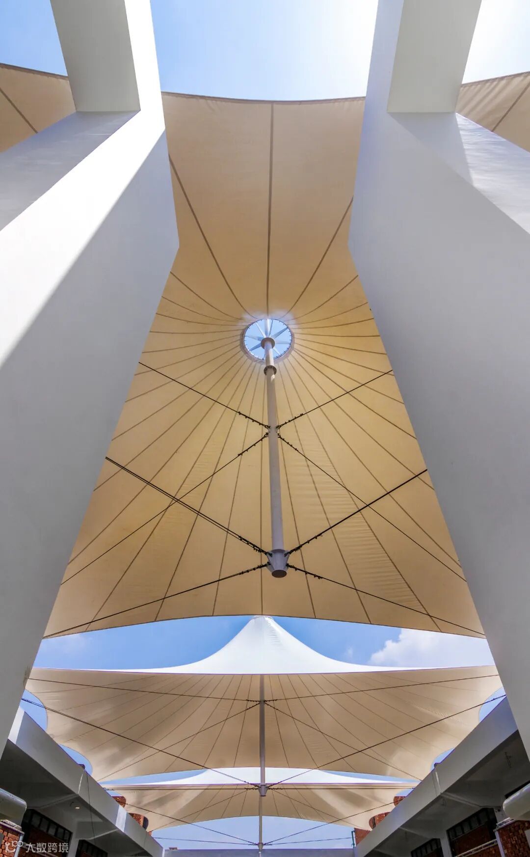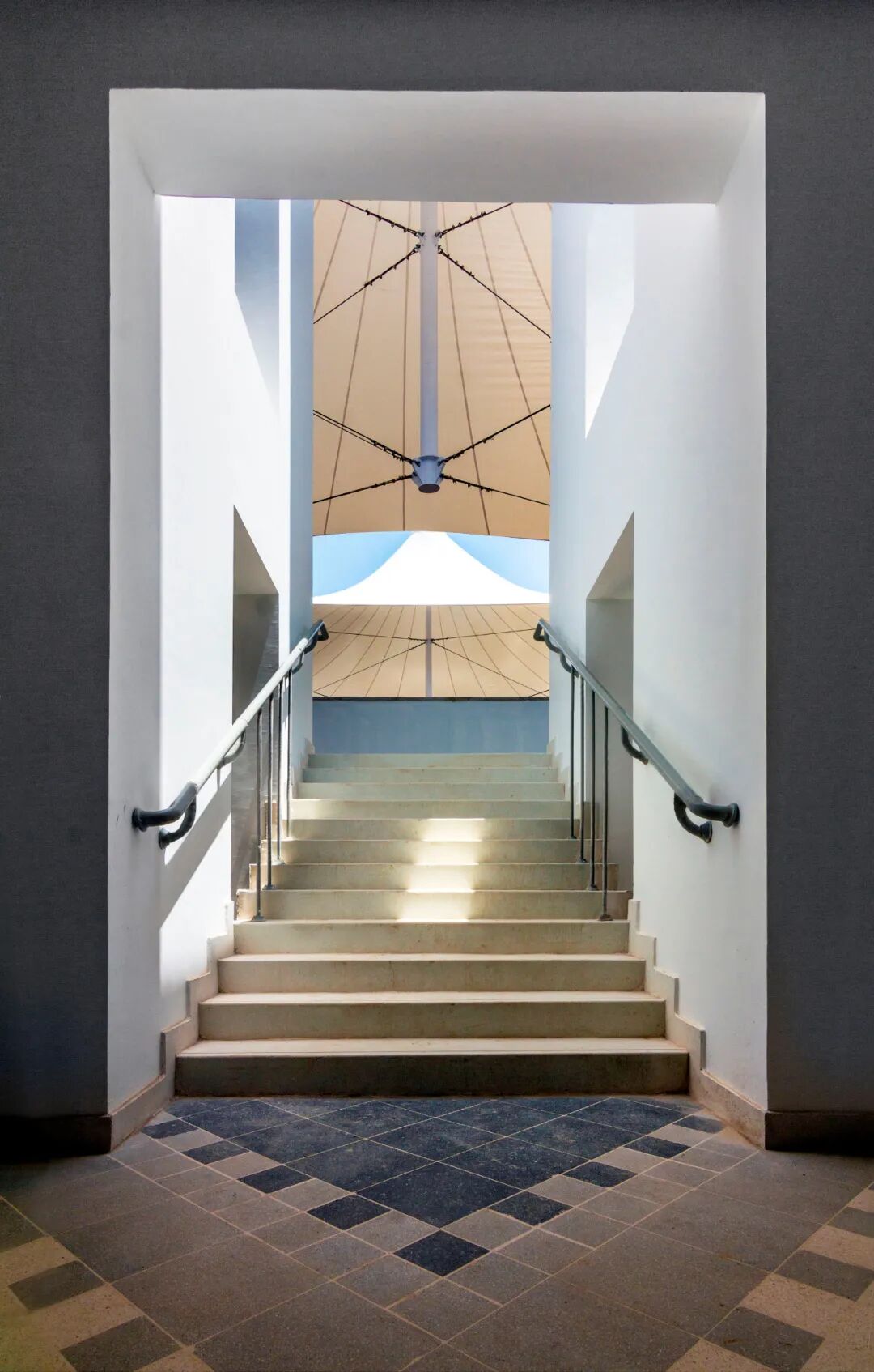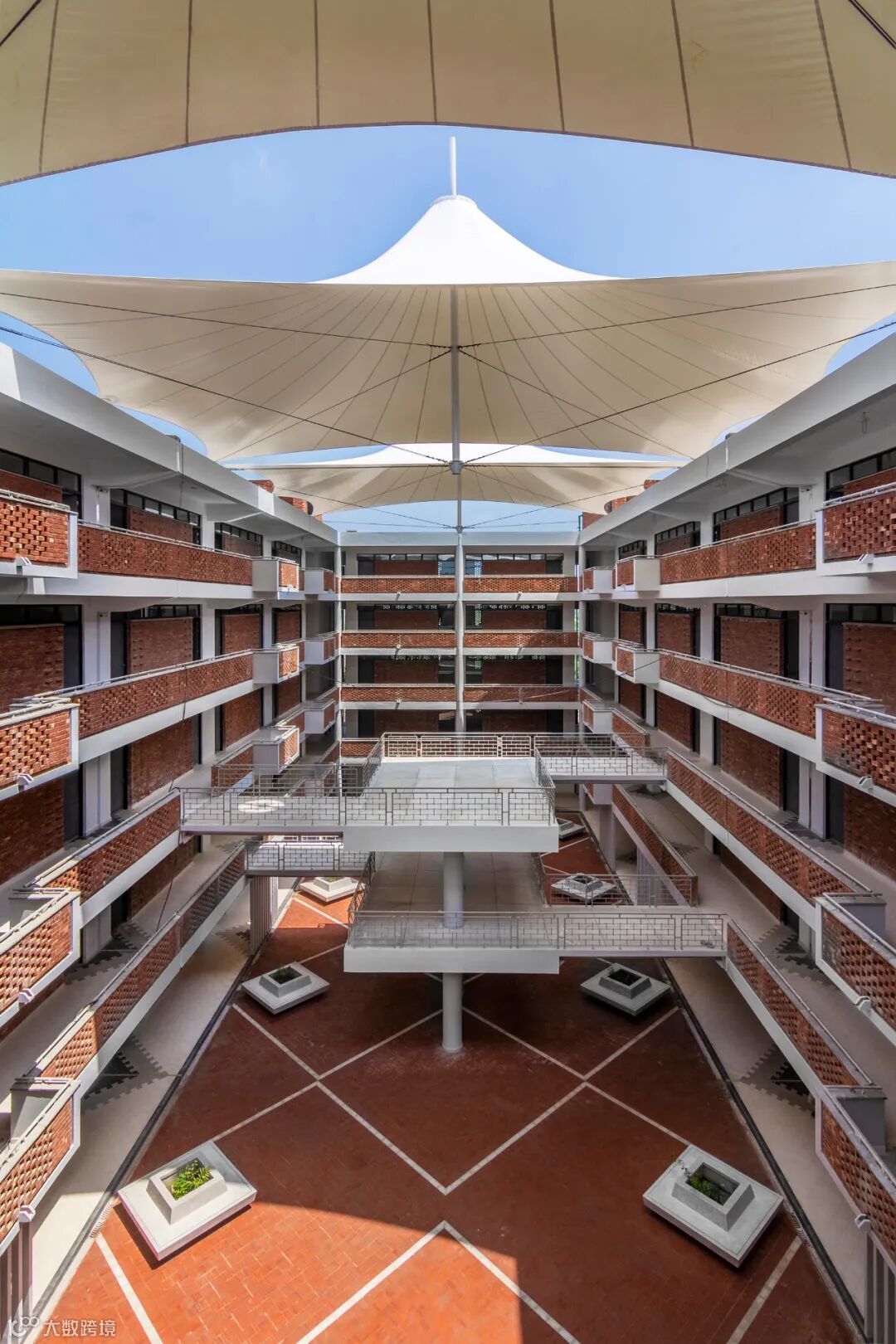 一个半透明的织物天篷漂浮在庭院之上,提供了遮阳,并与建筑形式的坚固性和缥缈的轻盈形成对比。横跨庭院的连接桥连接了所有楼层,并为学生提供了休息和非正式的聚会空间。