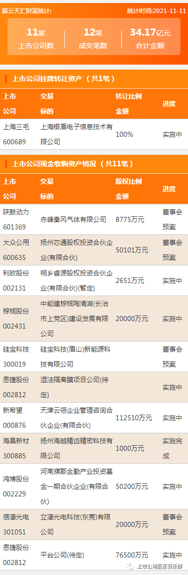 导读:2021年11月11日,资产交易合计金额34.17亿元,上市公司11家,成交12笔,,上市公司挂牌转让资产1