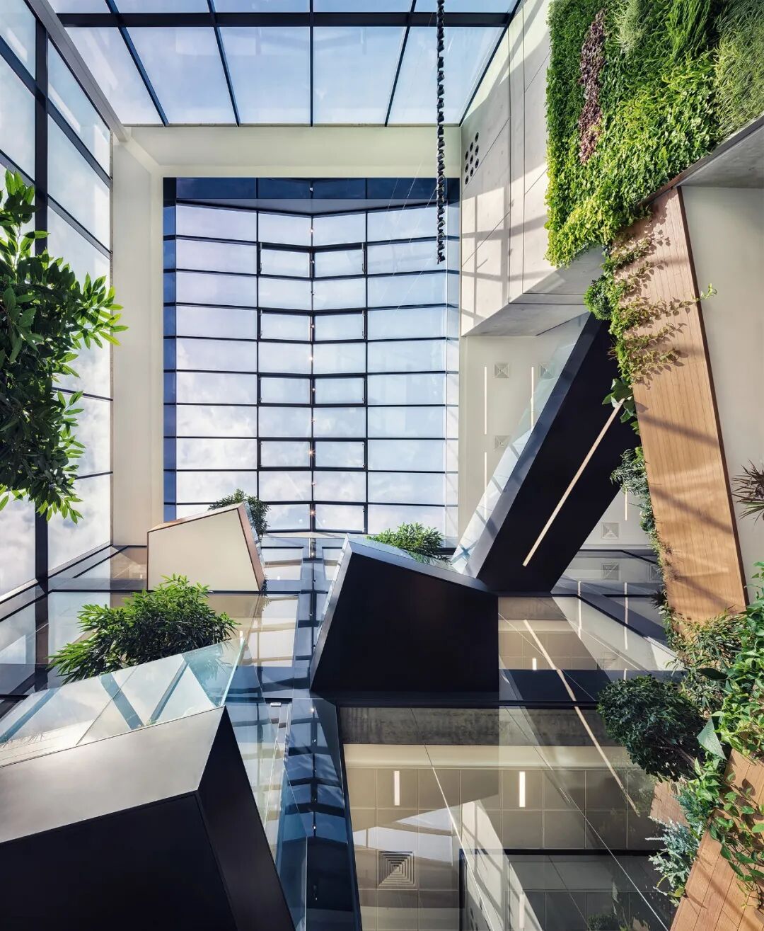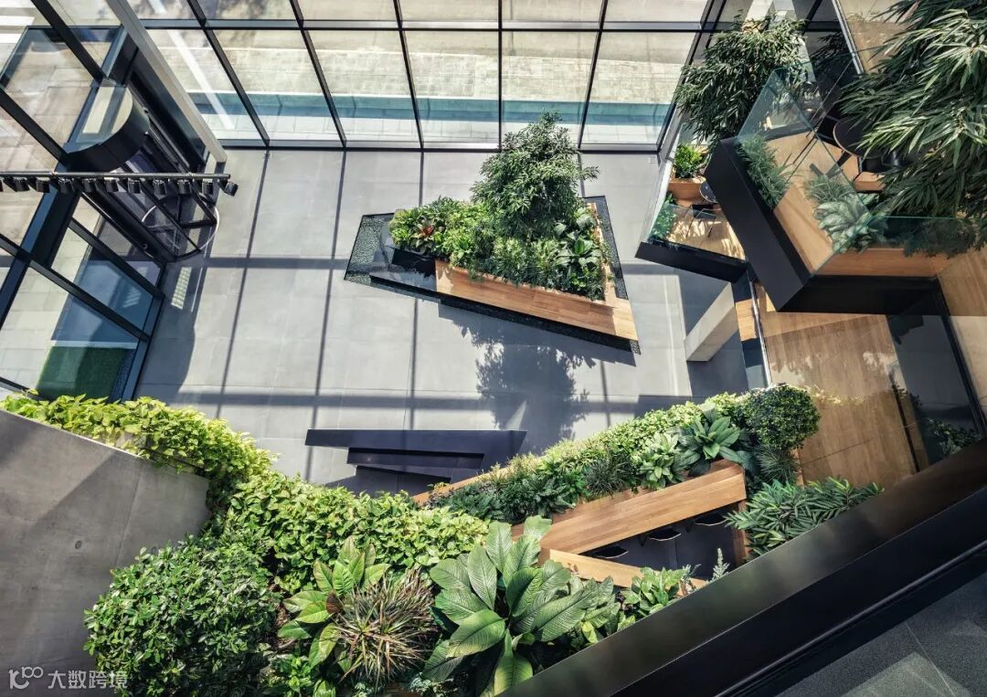 电梯的垂直核心,以及结构柱和梁都是由裸露的混凝土制成。天然木板在视觉上为中庭增色不少。第五种 "材料 "是自然植被,覆盖在阳台、休闲区和中庭上。