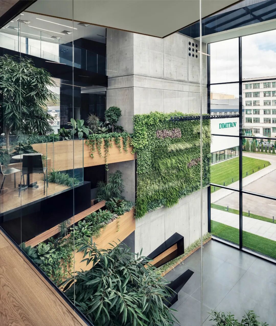 The architectural language of the project consists of a limited number of materials: glass, exposed concrete, aluminum and wood. The exterior of the building is strictly geometric and minimalistic – the clear glass prism of the exterior is interrupted only by the dark L-shaped aluminum canopy at the entrance. The large-format triple glazing glass panels allow for unobstructed views of the surrounding areas and provide a subtle transition between inner and outer space. As a counterpoint of the minimalist exterior, the interior of the building strikes with rich space of the atrium and the dynamic volumes of the balconies. The vertical core of the elevator, as well as the structural columns and beams are made of exposed concrete. Natural wood panels visually warm up the atrium. The fifth “material” is the natural vegetation, covering the balconies, the relaxation areas and the atrium.