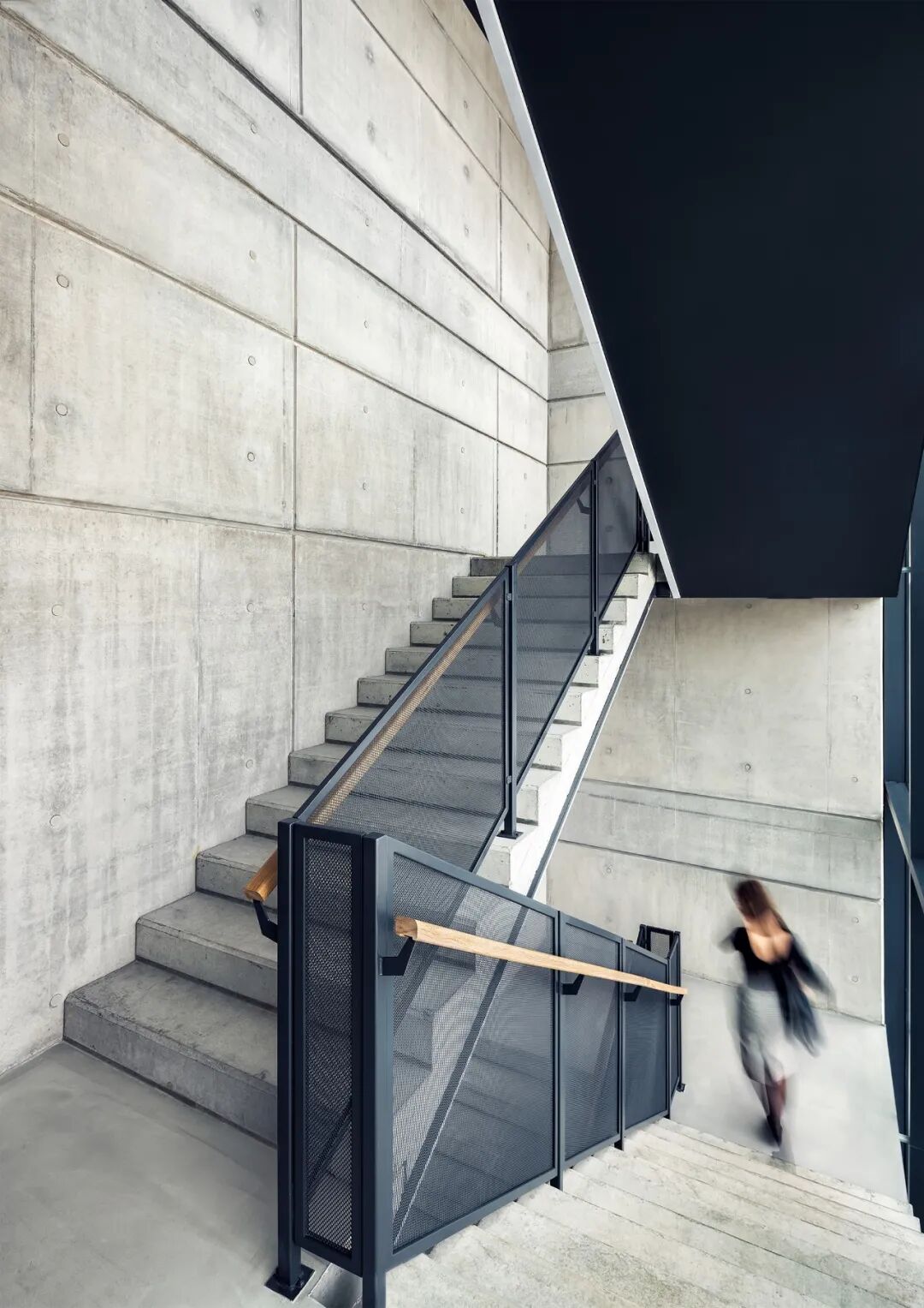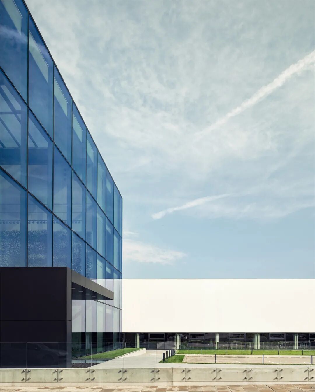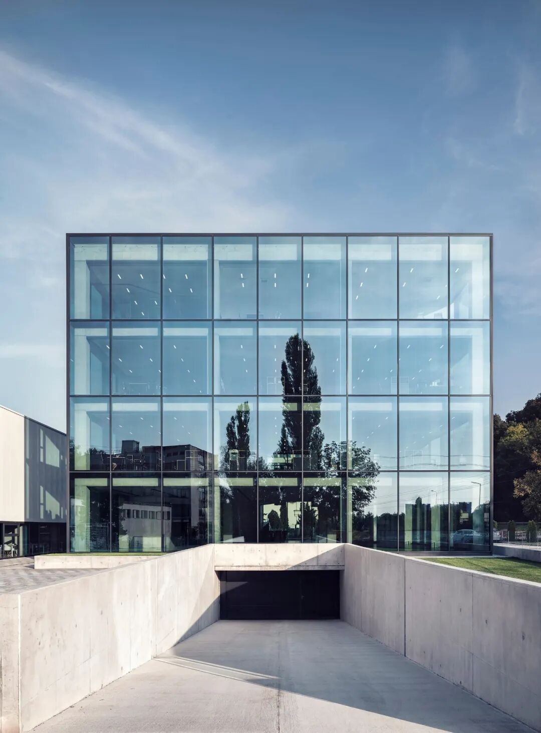 项目的建筑语言由有限的材料组成:玻璃、裸露的混凝土、铝和木材。建筑的外观是严格的几何学和极简主义--外部的透明玻璃棱镜只被入口处的深色L形铝制天棚所打断。
