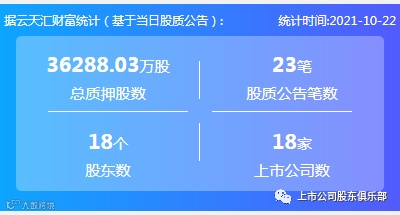 2021年10月22日,股票质押总质押股数36288.03万股,上市公司数18家,股质公告笔数23笔,股东数18个。