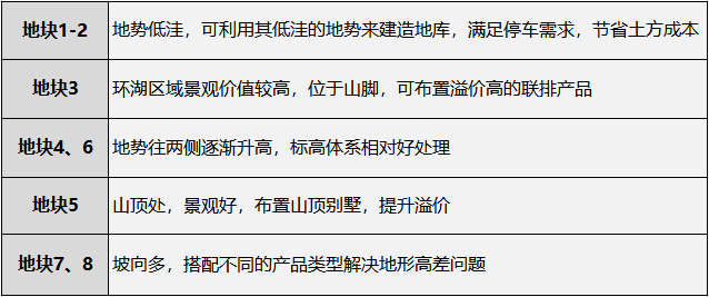 以5米(3.6(地库层高)+1.2(覆土)+0.2(室内外高差))为一台阶将原始地形进行简化,根据地形坡向及湖心景观资源,将地块切分为大小不同的8块用地,简化每块用地的坡向并分别进行分析处理。