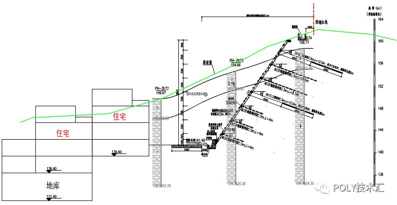 项目中高低分布的建筑物,利用其结构侧墙、地库外墙以及建筑物的基础,不仅可以满足项目的停车和竖向受力的要求,还可以将边坡支挡结构的一部分作为侧向受力构件。