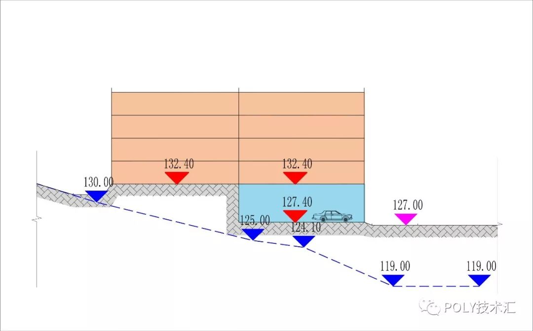 利用场地高差设计掉层车库,利用车库及覆土的高度来消化场地的高差。