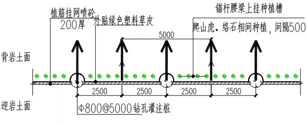 项目中,边坡局部支挡高度较小的区段采用了格构锚杆。为了更好的与建筑群配套,考虑边坡治理的生态措施,在格构间挂植生袋,培土植草;在板肋式挡墙的外立面挂塑料草皮,同时种植爬藤类植物。