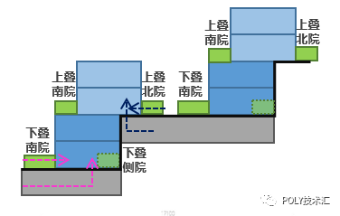 2、对于山地叠墅,建筑单体设计亦可根据地势情况采用吊层式设计,可通过上下叠入户关系的变化消化高差,利用下沉庭院解决下层住户的采光问题,同时可拉近上叠住户与其花园的空间关系。