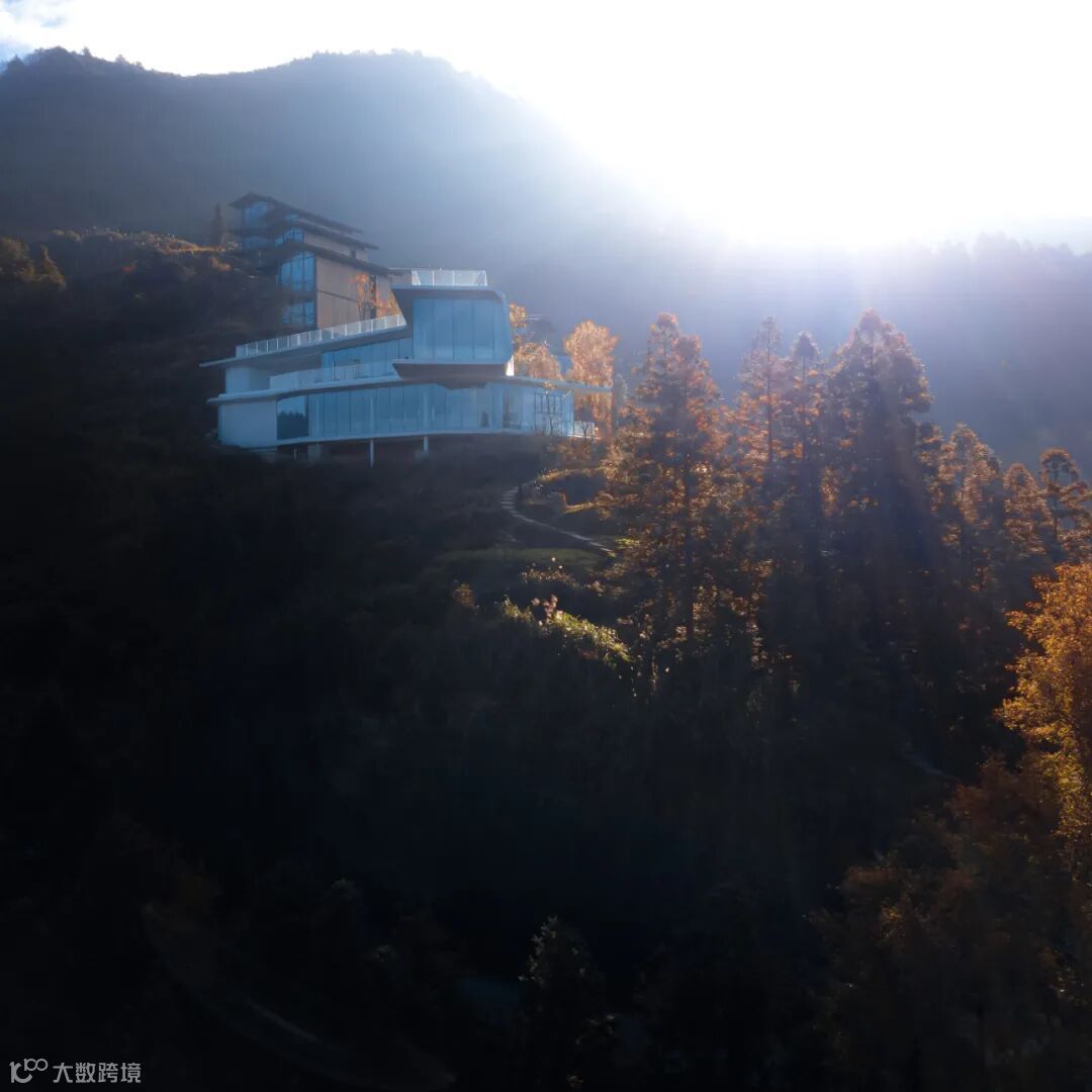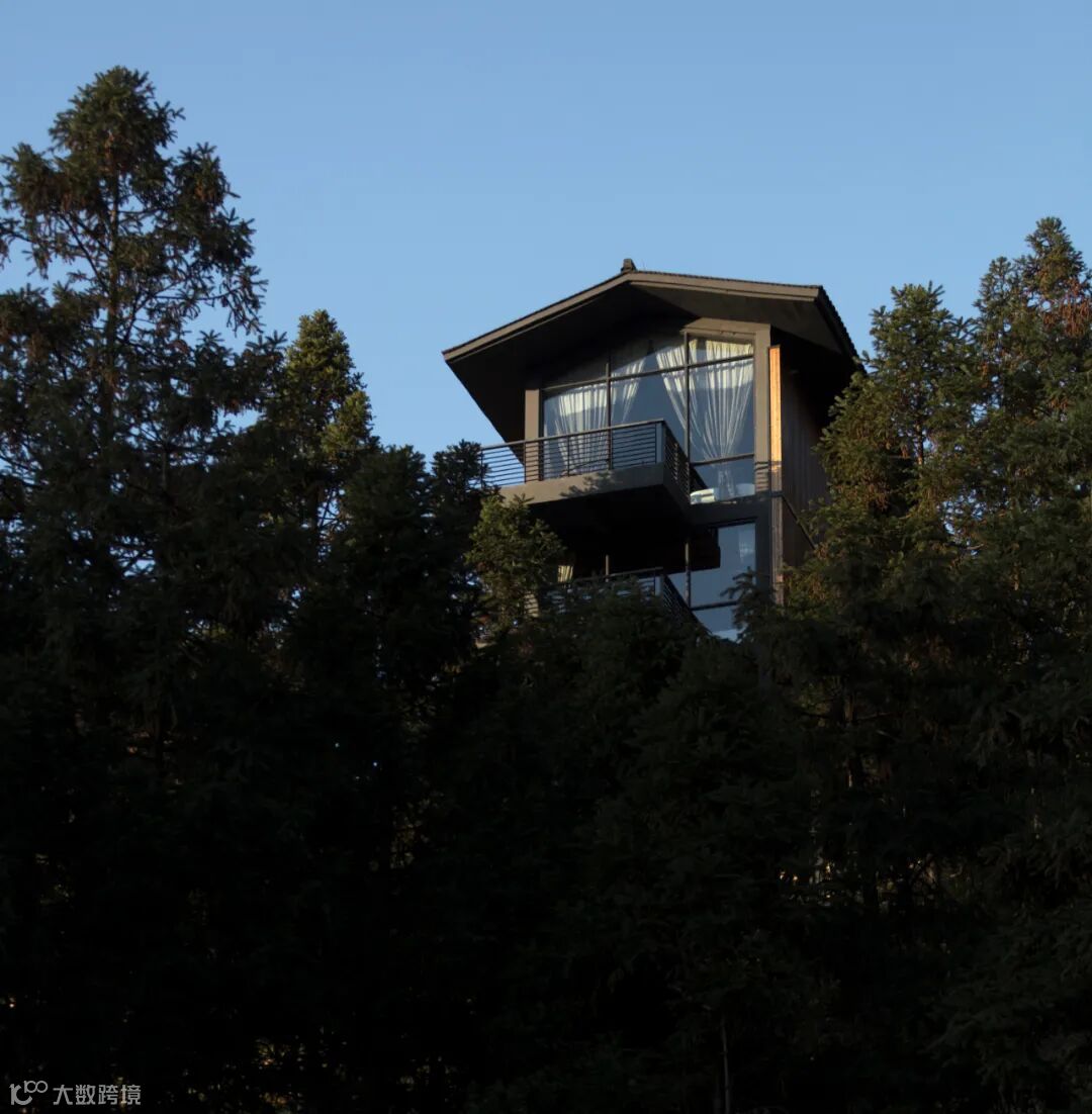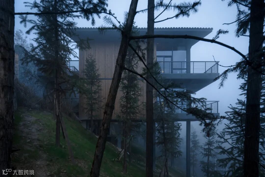 建筑体量漂浮在近45°的山体斜坡上,将玻璃、金属板等当代材料与毛石、小青瓦、木材等在地材料相混合利用,以脱离基底的建筑体量和融入山林的材料质感将建筑结构的“重”消解。设计基于在地条件,以现代的建造手法转译出传统吊脚楼依山就势的特点。