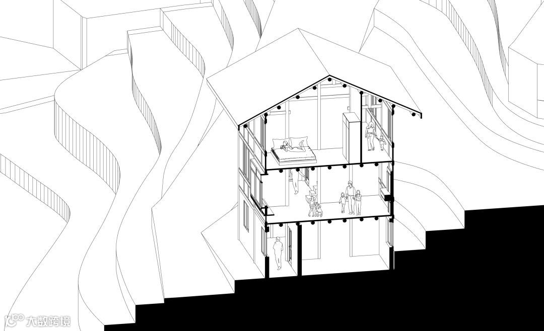 考虑到山地以及曲面施工的复杂性,建筑主体采用钢结构体系,外部包裹金属铝板,内部与室内界面留出空腔填充轻质保温以及防水材料。整体在工厂加工完成,现场吊装。建造简易迅速、运输方便安全,这样的选择,也充分应对了乡村现场施工的精度不足和山地施工的复杂条件。