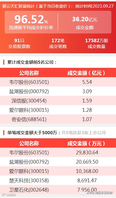 2021年9月27日,大宗交易成交金额36.20亿元,交易股票数91只,成交笔数172笔,流通股平均成交折价率96.52%,成交数量17582万股。