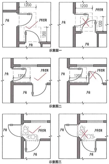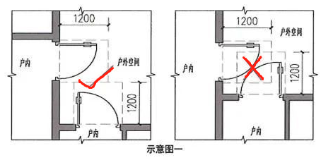 住宅建筑入户门设计应采用向户外开启的方式,且保证相邻户门在同时向外开启时,各户门在1.2mx1.2m范围内不应重叠。(见附件中示意图一)