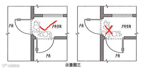 户门在向外开启过程中有可能产生门与门、门与人之间的碰撞时,相邻户门均应向户内开启,且户门的开启端不应临近设置。(见附件中示意图三)