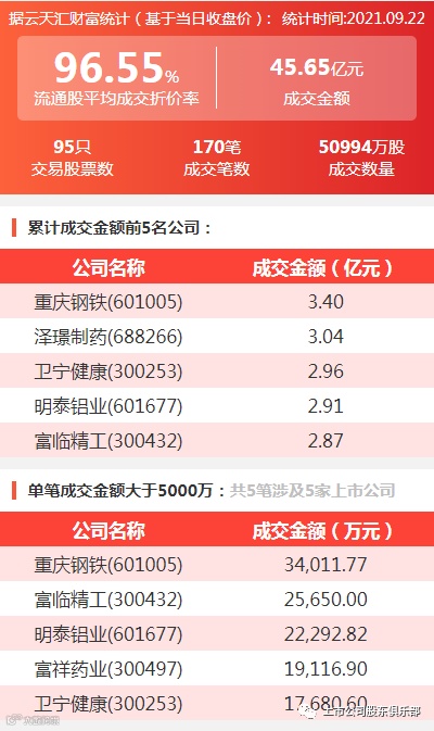 2021年9月22日,大宗交易成交金额45.65亿元,交易股票数95只,成交笔数170笔,流通股平均成交折价率96.55%,成交数量50994万股。