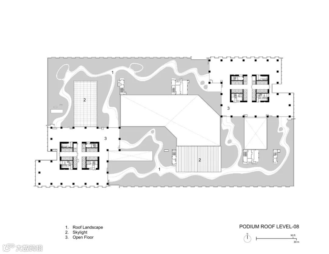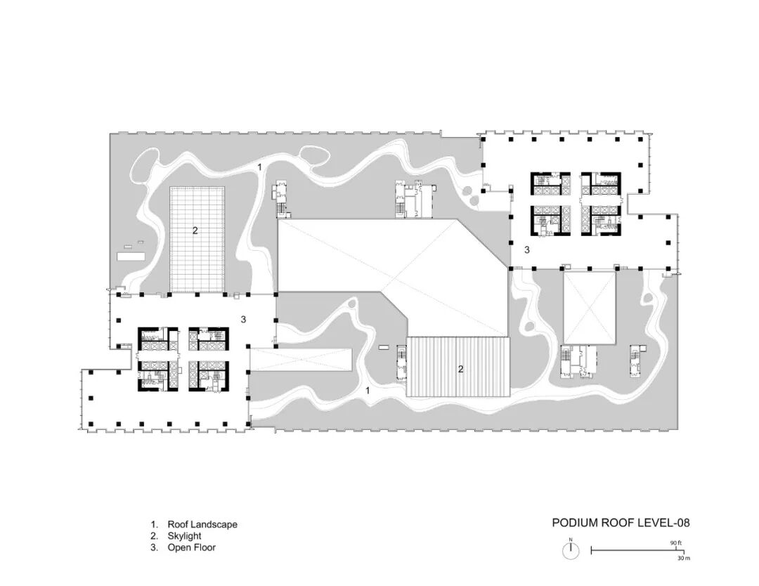 庭院通过绿色走廊连接到场地的南面和东面,方便了人流向周围众多功能的转移。通过一系列的景观广场,游客和员工被食品和零售亭所包围,有助于加强社区参与和互动。一个绿色的屋顶空间完成了设计,并提供了一个从街道和低层的活动中喘息的机会。