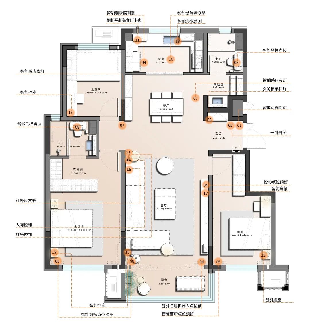 在设计中融入了17项智能点位,赛拉维对居住过程中可能会产生的痛点,进行逐个击破,让家与居住者之间更加贴合。