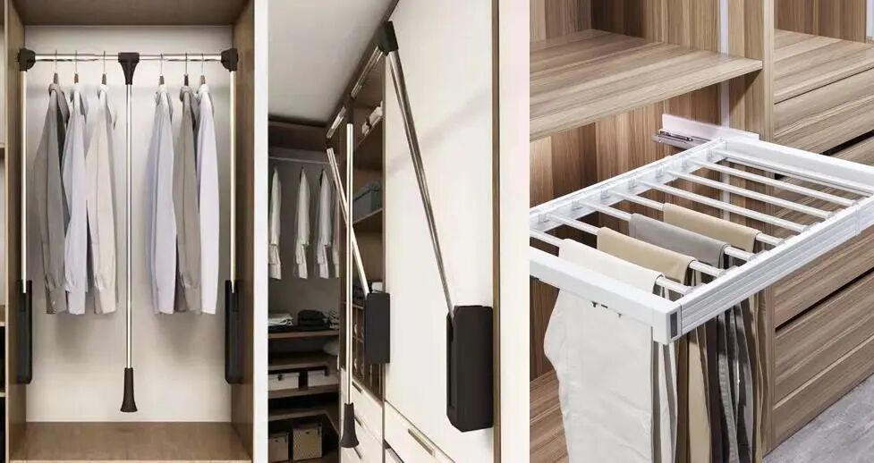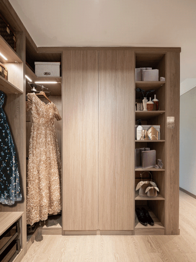 来到衣帽间,在西裤架中取出西裤,从下拉挂衣杆挑选西服,再从抽屉中取出重要文件,最后从长衣挂置区取出大衣,准备迎接新一天的工作。