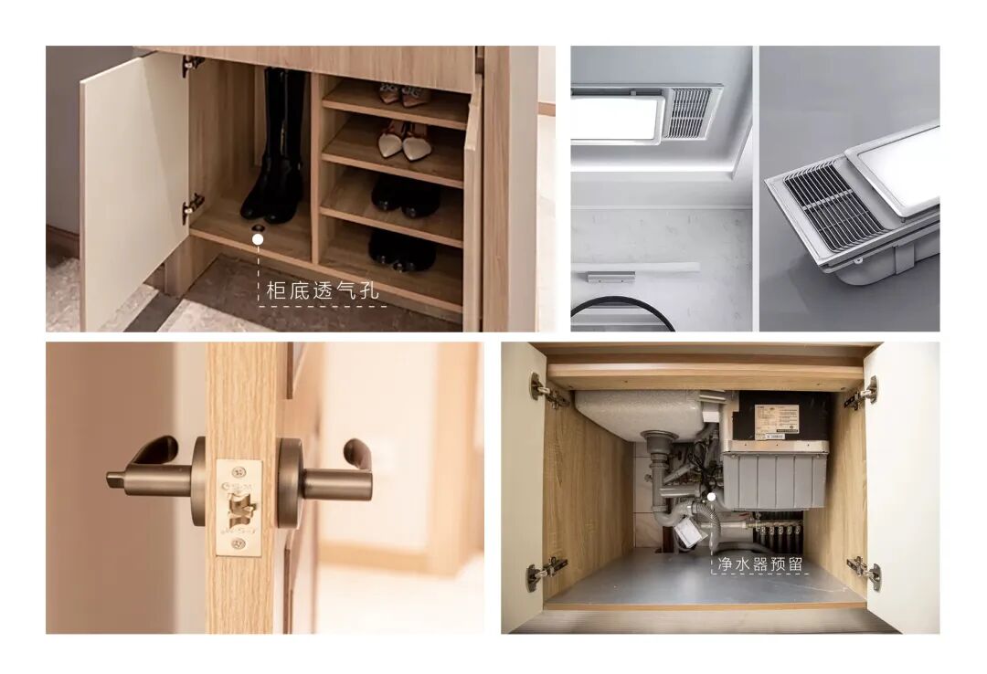 ▲柜底透气孔&净水点位预留&风暖浴霸&静音门锁
