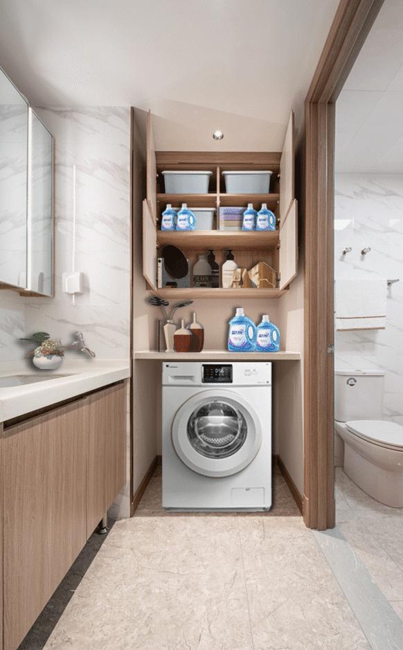独立的家政空间在收纳方面也是毫不逊色,不仅预留了洗衣机的空间,烘干机及壁挂洗衣机的预备条件也已经合理布置。