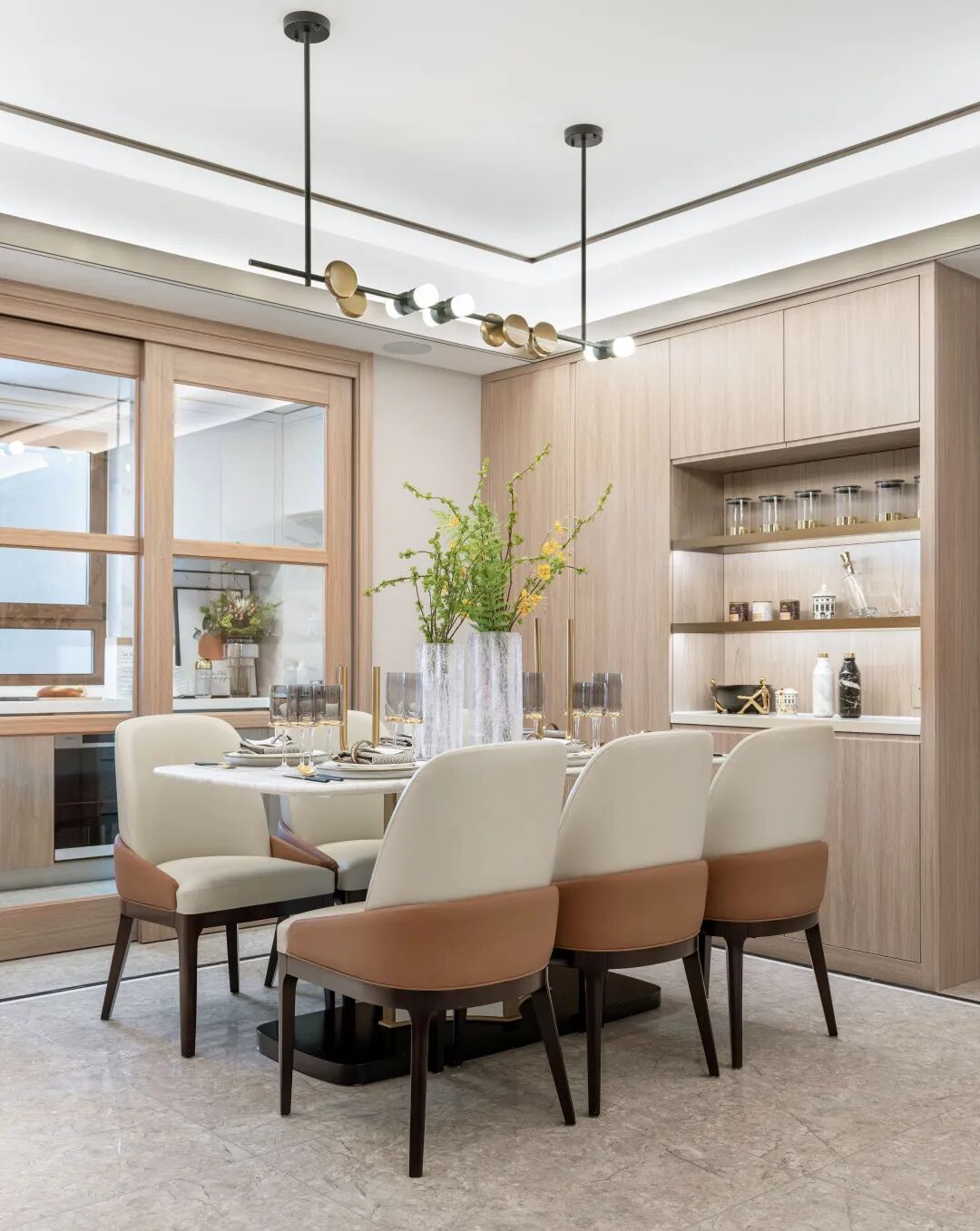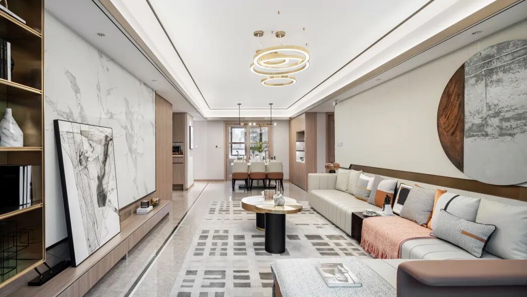 空间以现代简约手法铺陈发散,意在寻求时尚奢华与归家自在之间的平衡,肌理感极强的皮革与壁纸增加了空间的质感,加以金属的精致感提升空间的价值感;同时空间具备灵活可塑性,无时无刻为生活带来新鲜的多元化体验感。