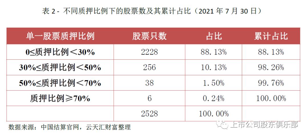 据中国结算2021年7月30日公布的数据显示,共计2528只股票在中国结算有存续质押登记,相比6月减少4只,其中:88.13%的股票全市场质押比例低于30%,98.26%的股票全市场质押比例低于50%。